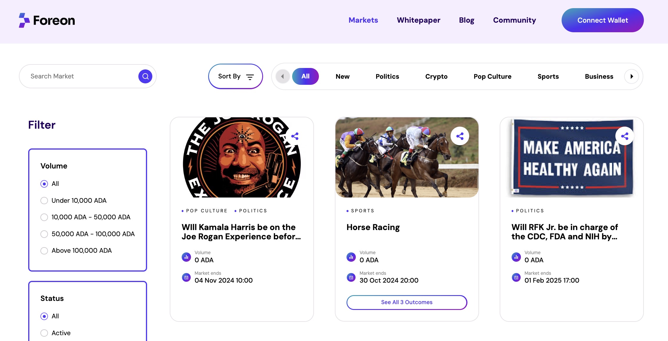 Foreon Network is a community-driven prediction market platform that uses the Cardano blockchain to foster a transparent, secure, and efficient environment where users can create, trade and resolve markets predicated on the outcomes of future events.